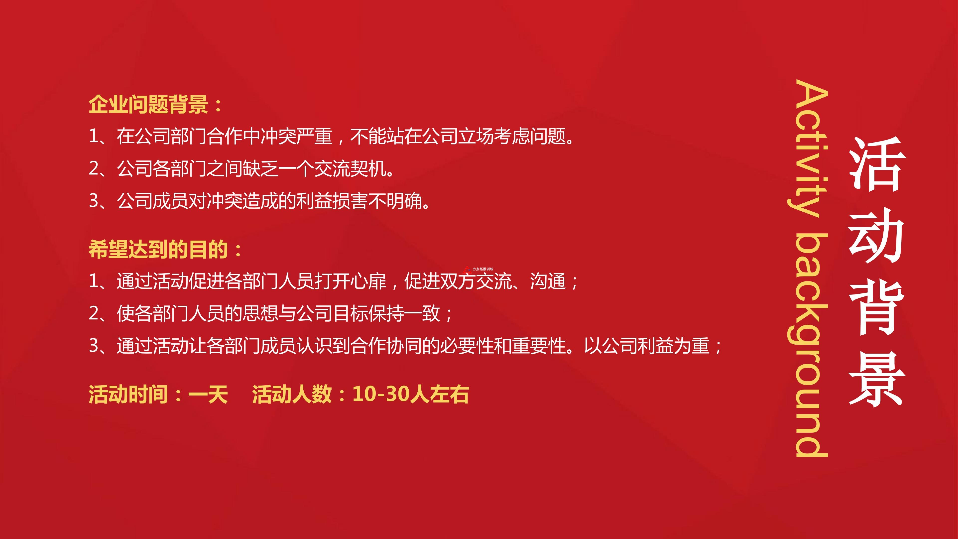 1、通過活動促進(jìn)各部門人員打開心扉,促進(jìn)雙方交流、溝通;