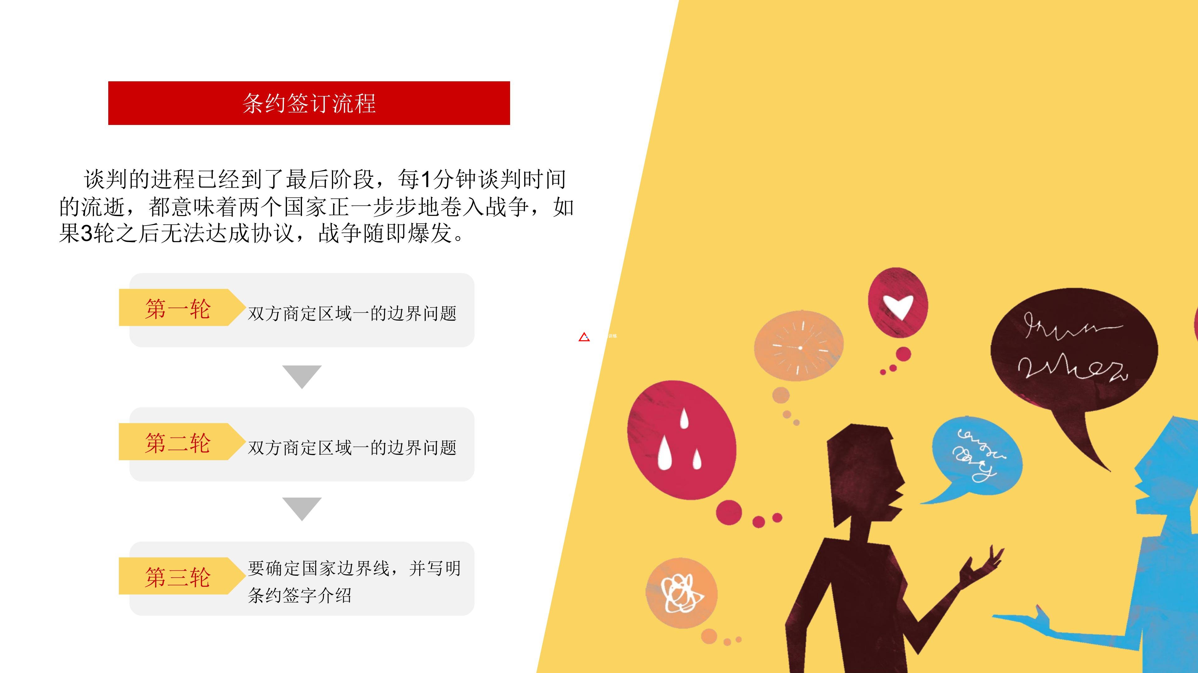 在這次談判會議上,如果不能解決邊界的爭端,則可能會導(dǎo)致兩國之間的戰(zhàn)爭。為了阻止戰(zhàn)爭,談判會議必須拿出一個讓雙方都同意并在其上簽字的條約。