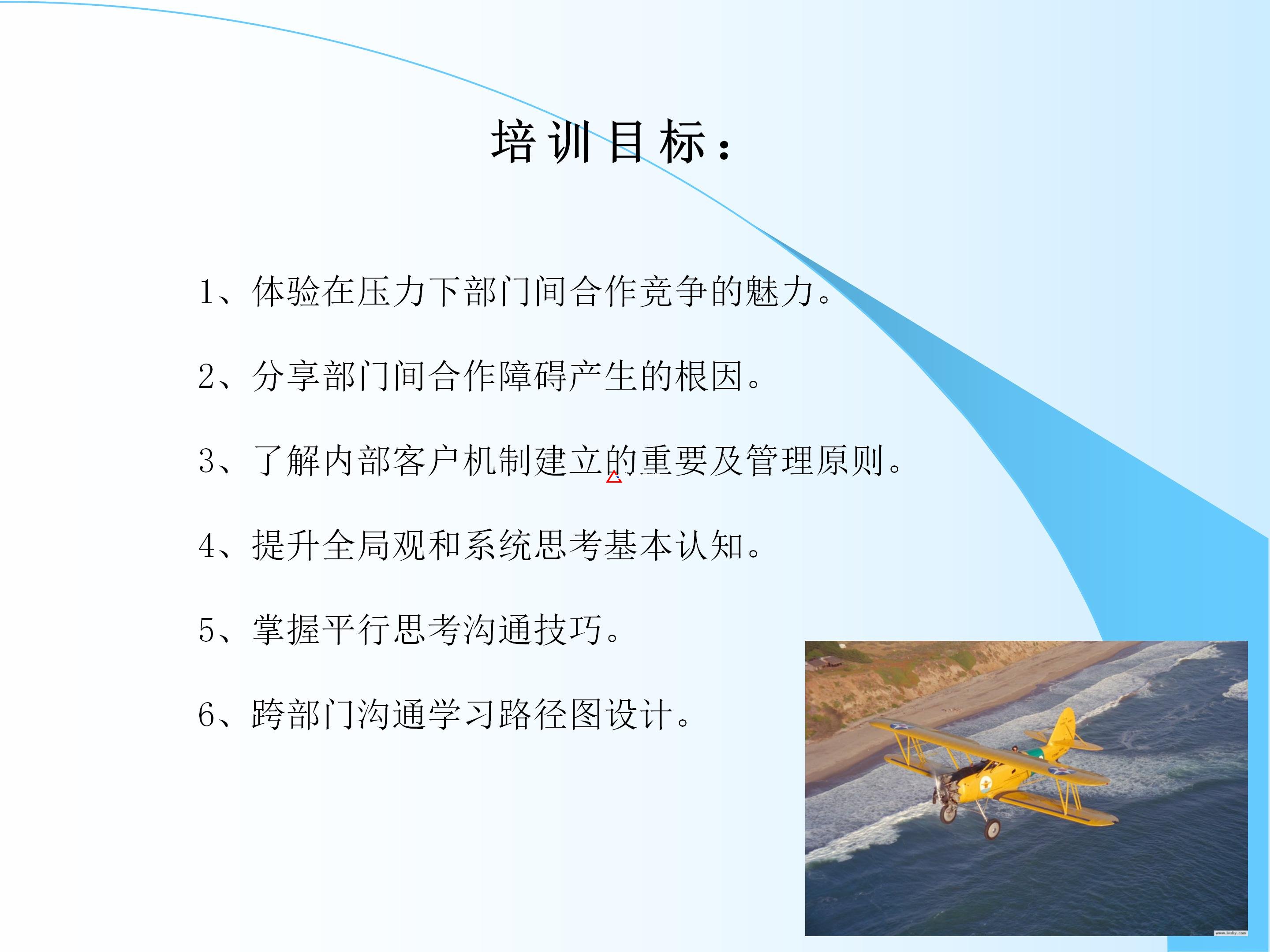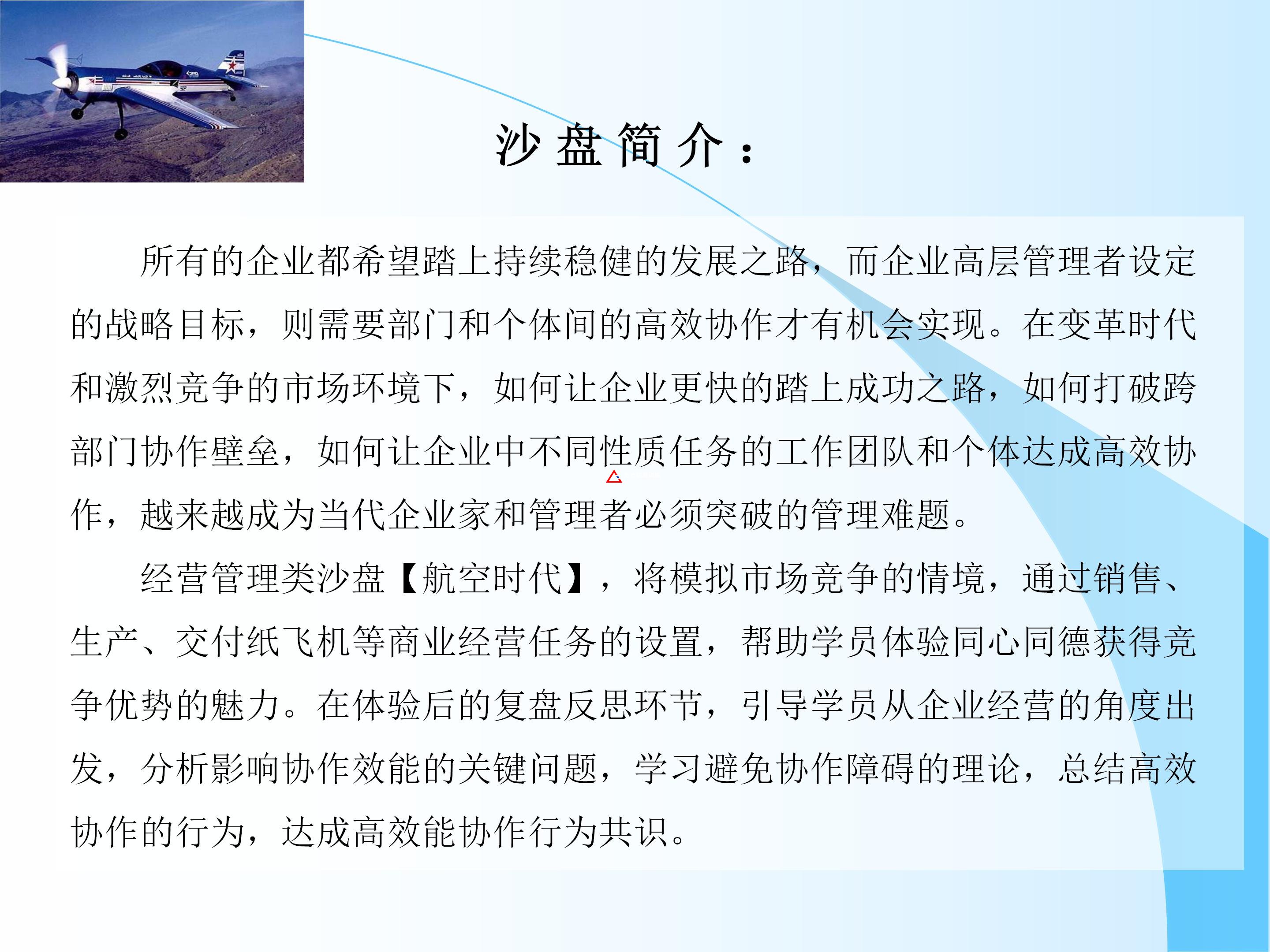 經(jīng)營(yíng)管理類沙盤【航空時(shí)代】,將模擬市場(chǎng)競(jìng)爭(zhēng)的情境,通過銷售、生產(chǎn)、交付紙飛機(jī)等商業(yè)經(jīng)營(yíng)任務(wù)的設(shè)置,幫助學(xué)員體驗(yàn)同心同德獲得競(jìng)爭(zhēng)優(yōu)勢(shì)的魅力。在體驗(yàn)后的復(fù)盤反思環(huán)節(jié),引導(dǎo)學(xué)員從企業(yè)經(jīng)營(yíng)的角度出發(fā),分析影響協(xié)作效能的關(guān)鍵問題,學(xué)習(xí)避免協(xié)作障礙的理論,總結(jié)高效協(xié)作的行為,達(dá)成高效能協(xié)作行為共識(shí)。